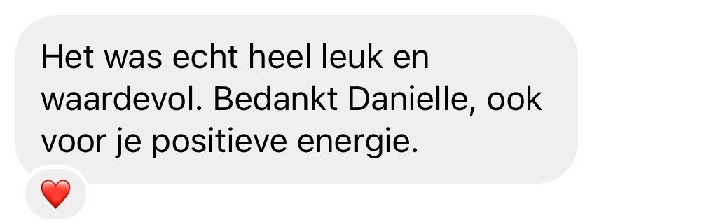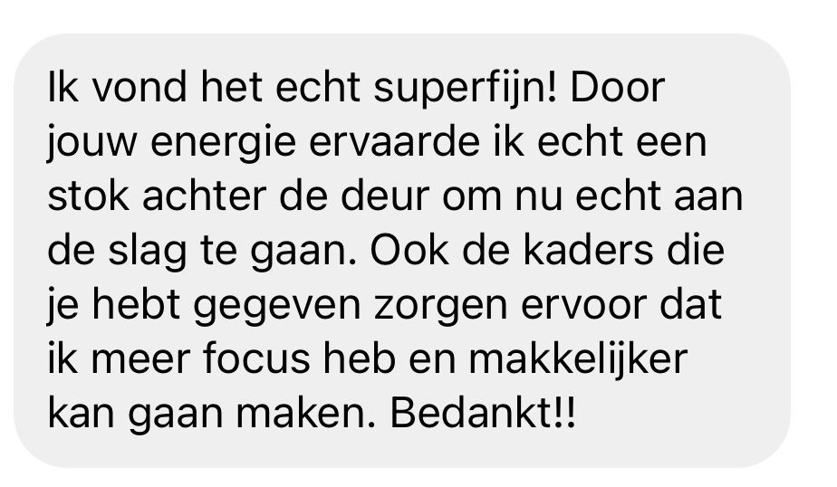 We hebben wekelijks een sessie, daarnaast kun je mij dagelijks benaderen voor vragen via Whatsapp en e-mail.
